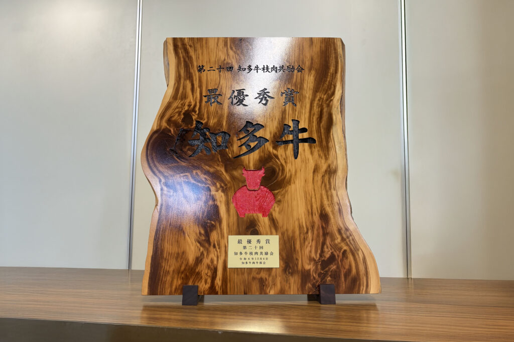 最優秀賞には数々の褒章他、記念の盾が贈呈されます。生産者の方は記念の盾がほしくトップを狙える牛を数ヶ月前から選畜しています。今回盾の材木はイチイの木としました。珍しい木ではないのですが、大木になる事が少なく、脇枝が多い事で節が沢山できる為、盾にするには難易度が高い材となります。また一位の方へとの意味も含め役員にて決定されました。