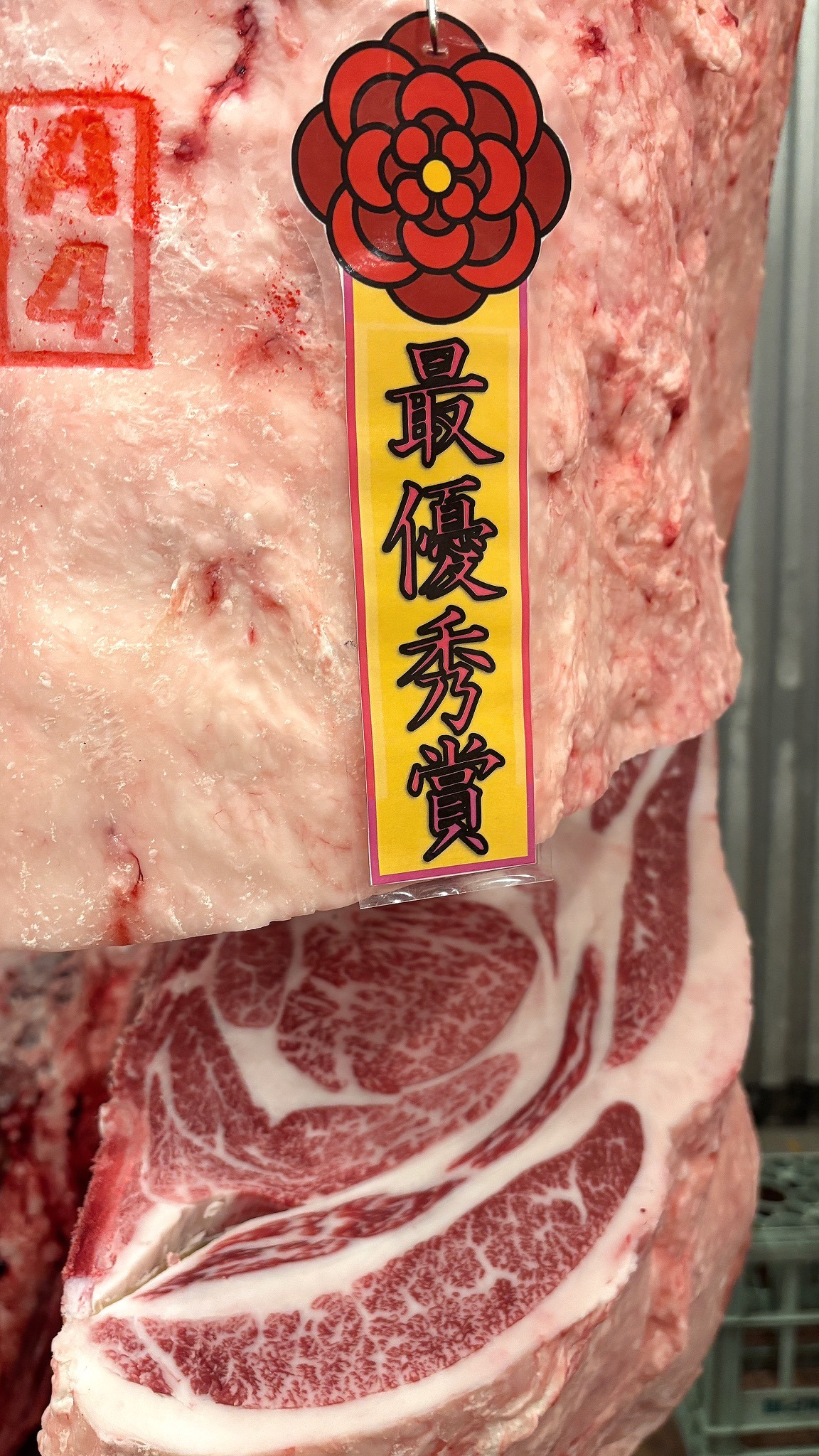 最優秀賞に輝いた平和タケトヨ牧場様の枝肉は、ロース芯が非常に大きく、全体のバランスも秀逸。